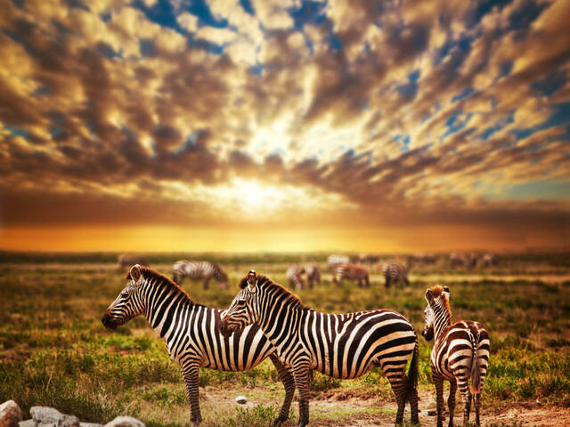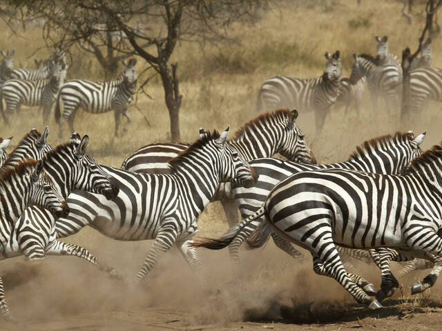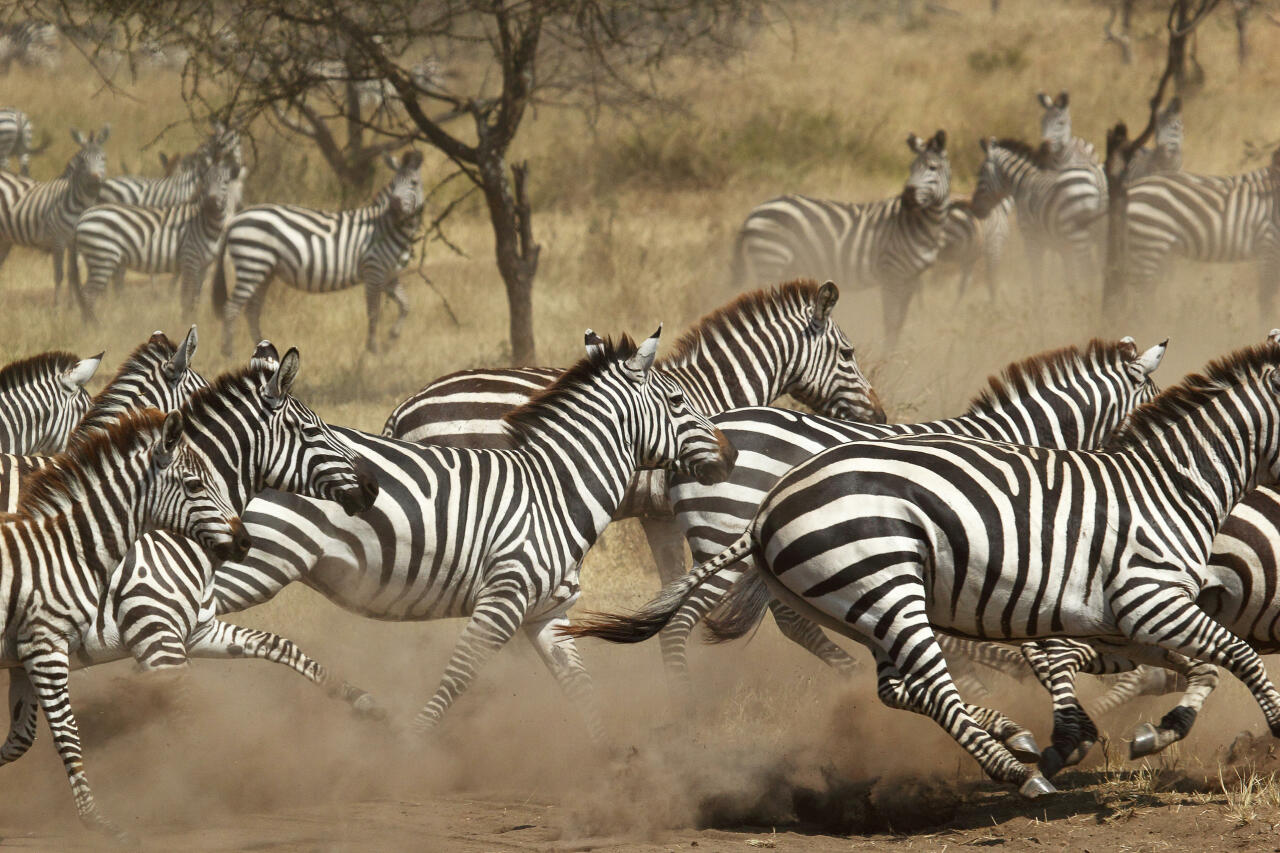 A herd of common zebras (Equus Quagga) gallopping in Serengeti National Park, Tanzania