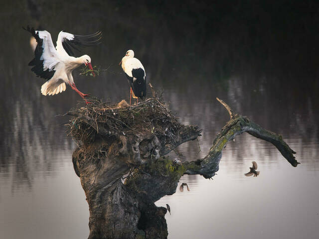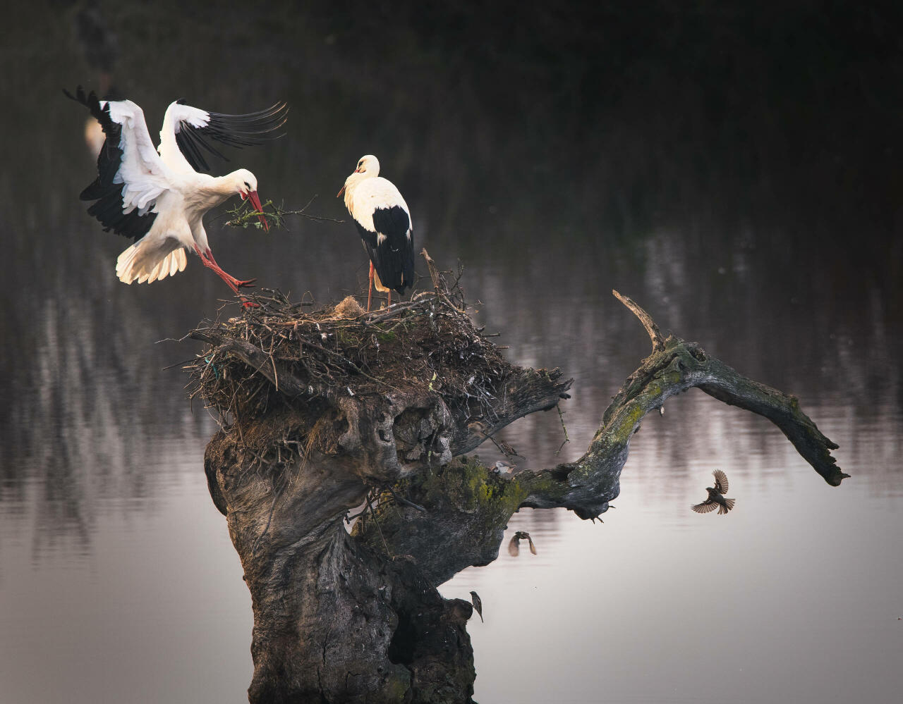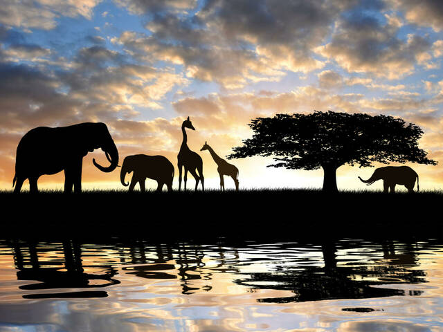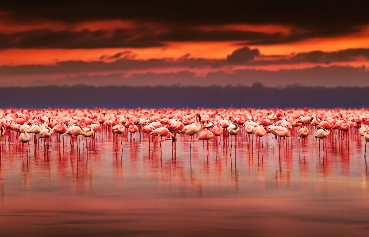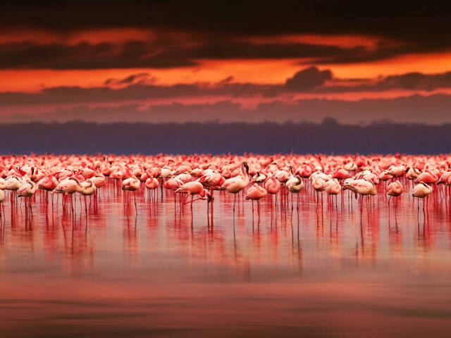 African flamingos in the lake over beautiful sunset, flock of exotic birds at natural habitat, Africa landscape, Kenya nature, Lake Nakuru national park reserve