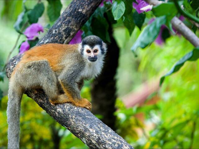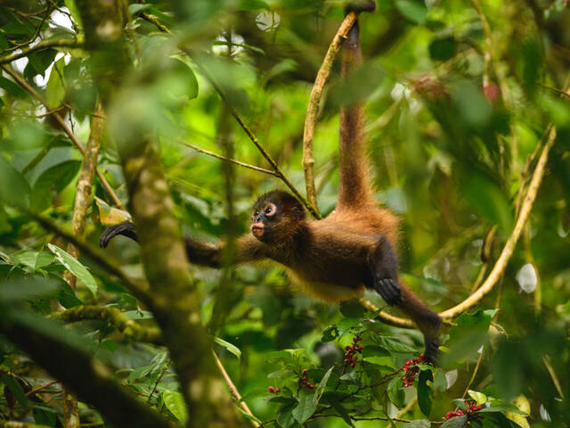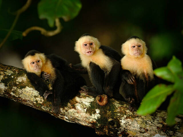 White-headed Capuchin, Cebus capucinus, black monkey sitting on the tree branch in the dark tropic forest, animal in the nature habitat, wildlife of Costa Rica