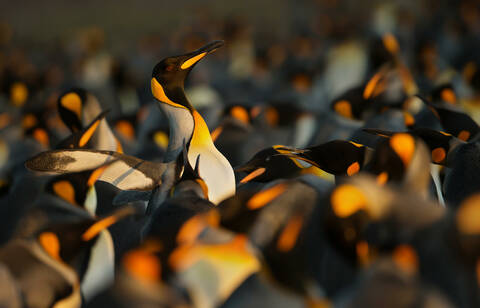 Description: King penguins displaying aggressive behavior towards another King penguin during mating season, Falkland islands.