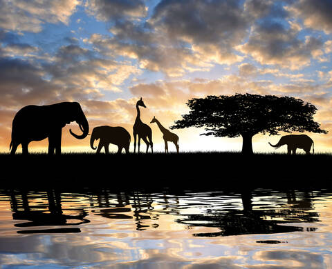 Description: African flamingos in the lake over beautiful sunset, flock of exotic birds at natural habitat, Africa landscape, Kenya nature, Lake Nakuru national park reserve