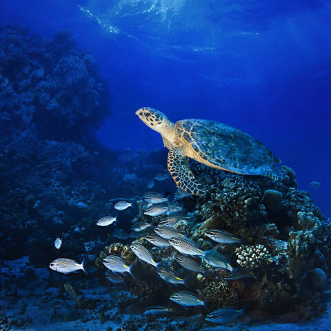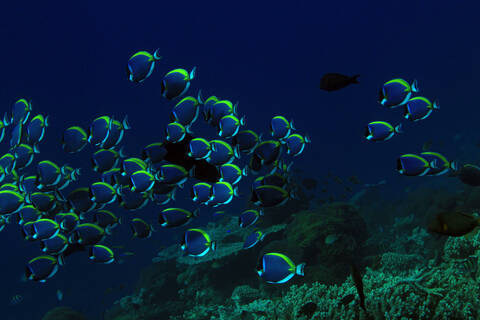 Description: School of Powderblue Surgeonfish (Acanthurus Leucosternon) over Coral Reef, South Ari Atoll, Maldives