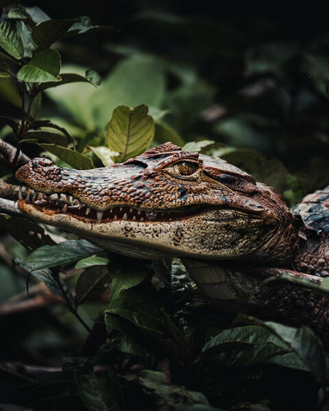 Title: wild caiman with fish mouth nature habitat wild brasil brasilian wildlife pantanal green jungle south american nature wild dangereous