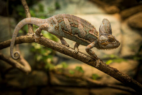 Description: Photo of colorful reptilian eye, closeup head part of chameleon, multicolor scaly skin of lizard, african animal, beautiful exotic iguana, wild nature, fauna of rainforest