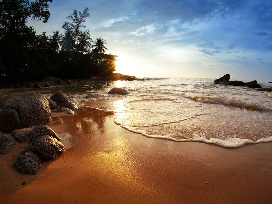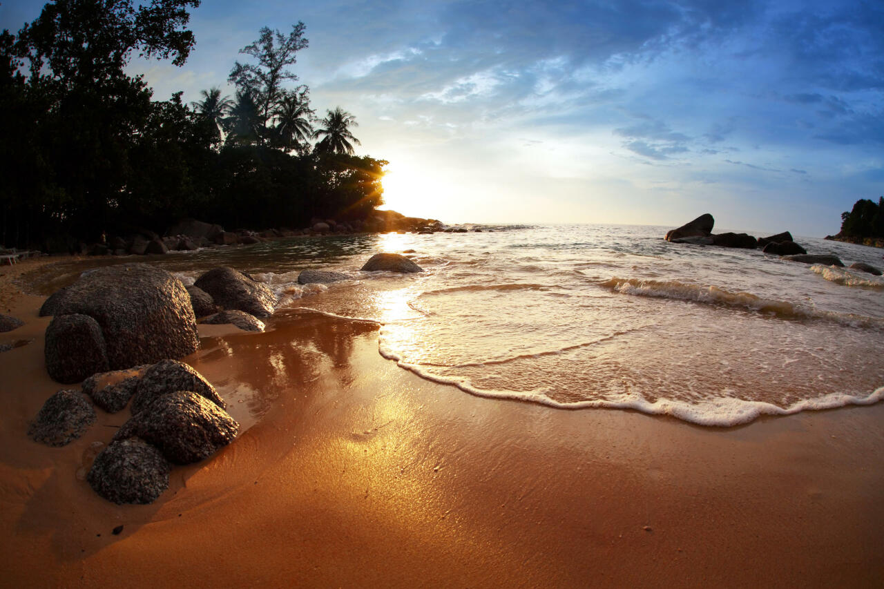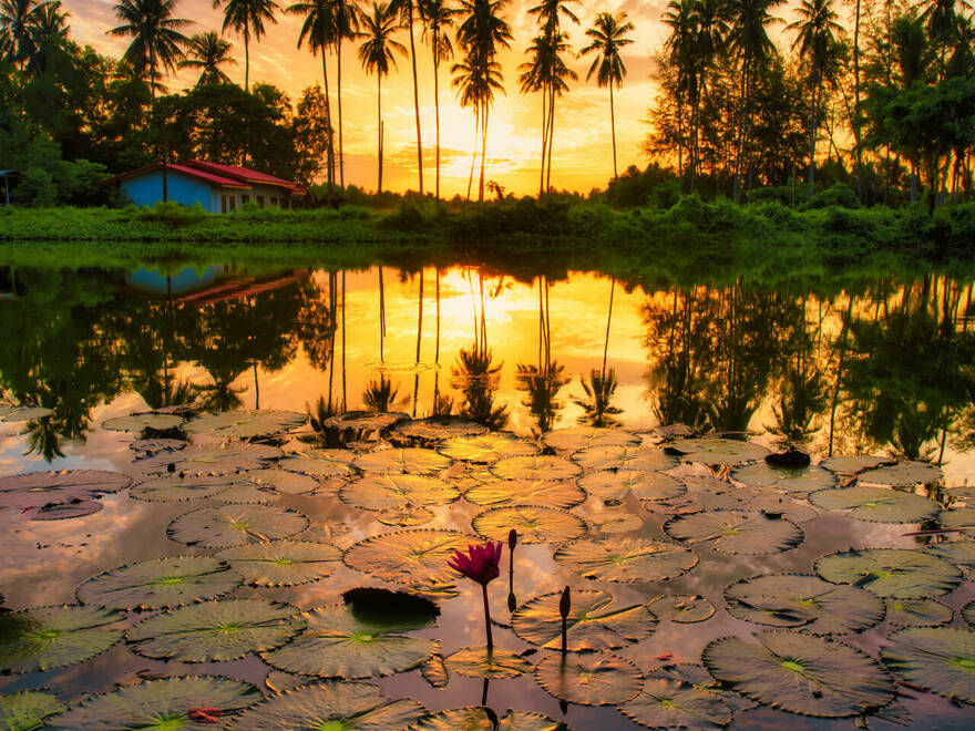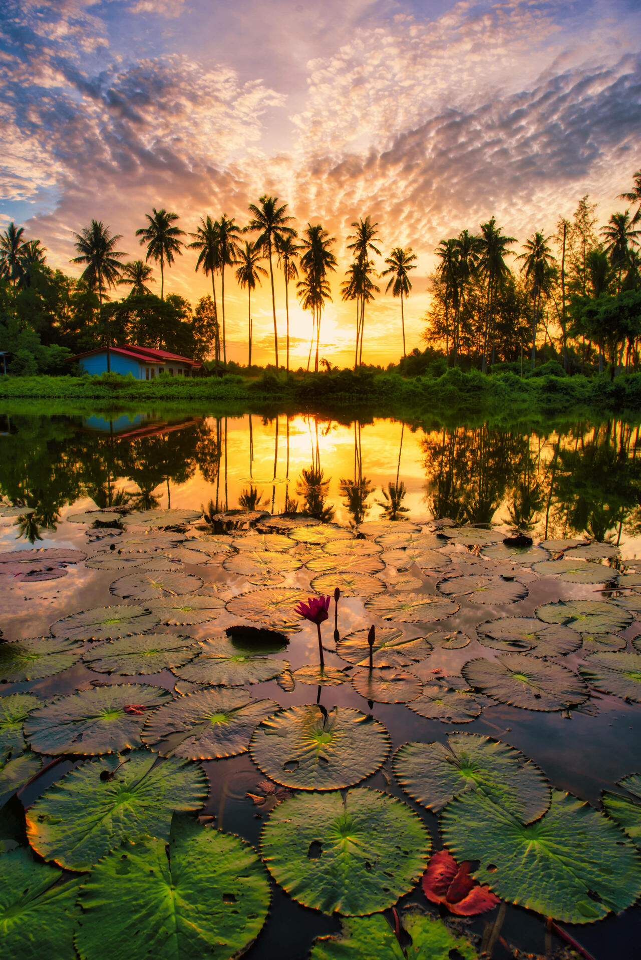 red lotus flower silhouette coconut palm trees sunrise nakorn si thammarat thailand