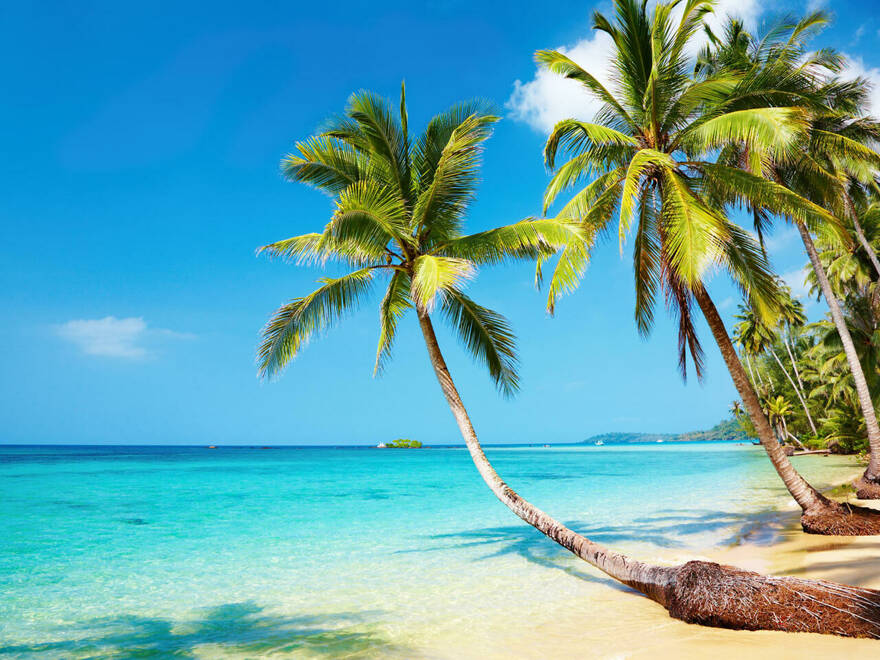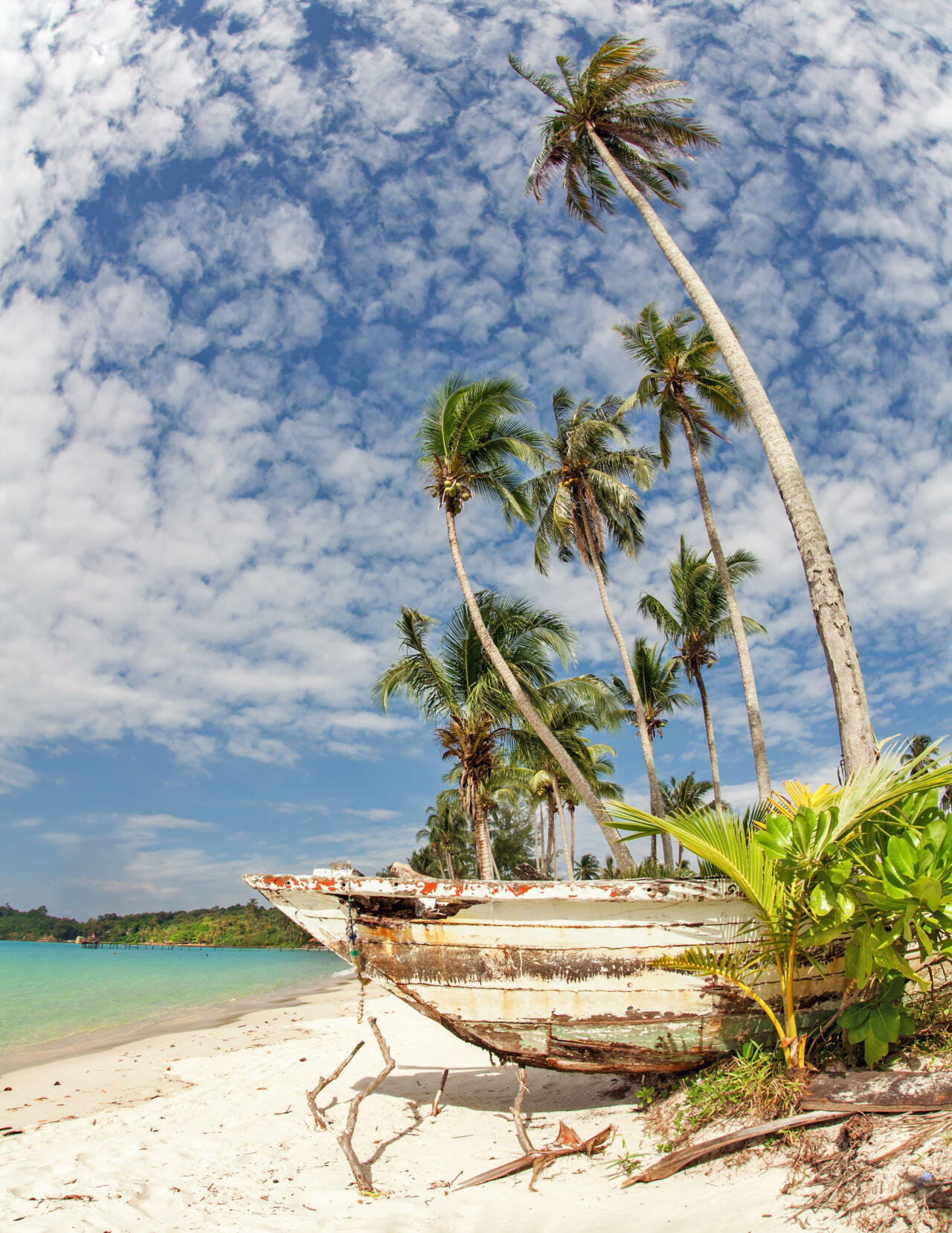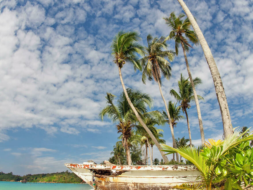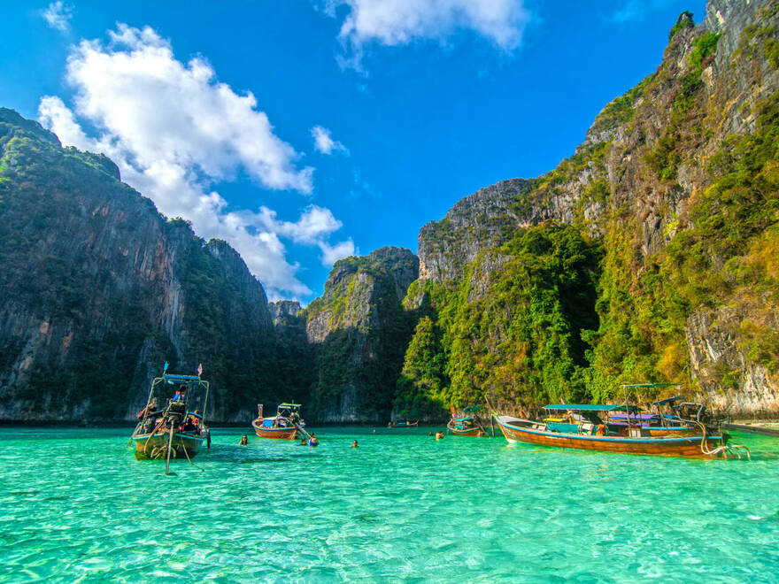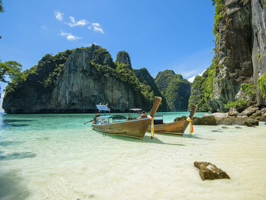 view thai traditional longtail boat clear sea sky sunny day phi phi islands thailand