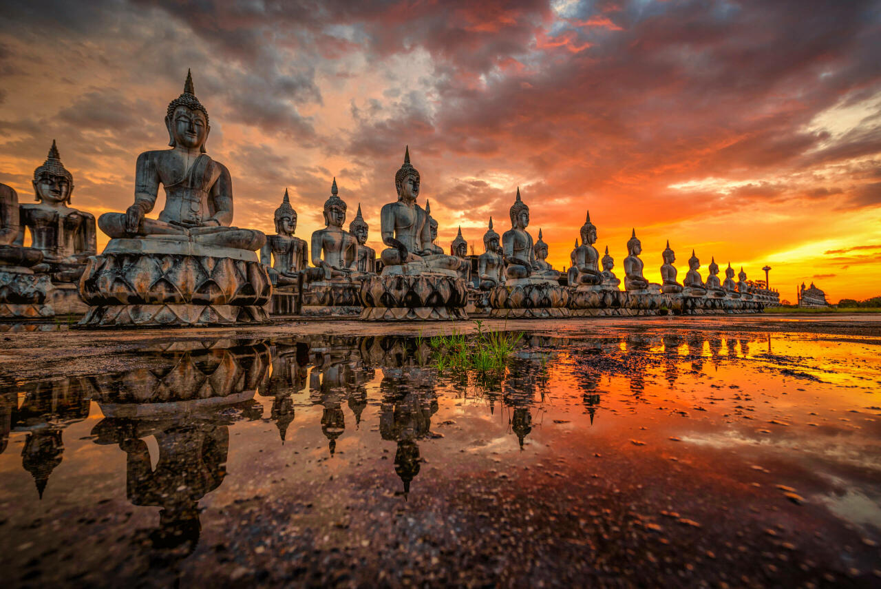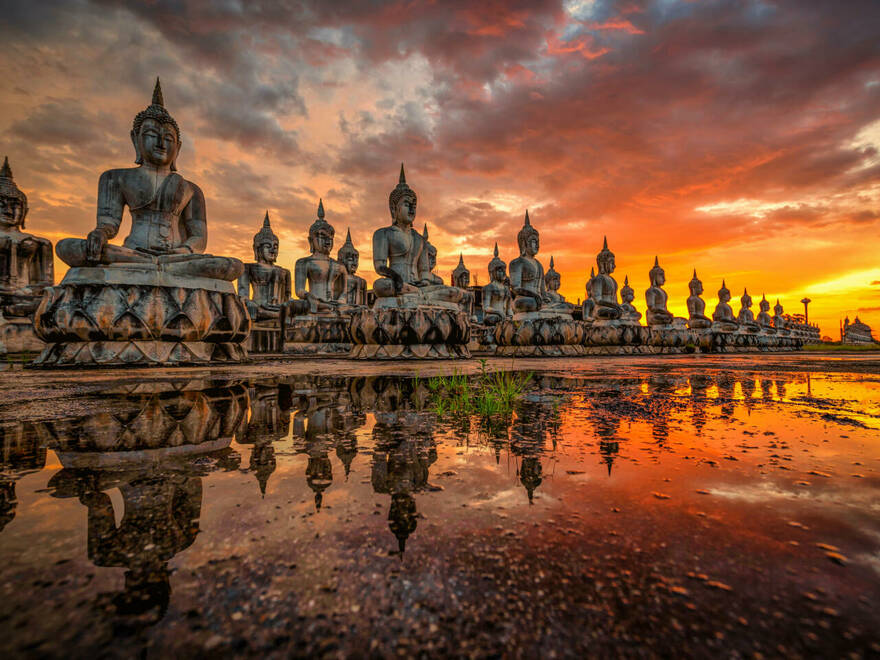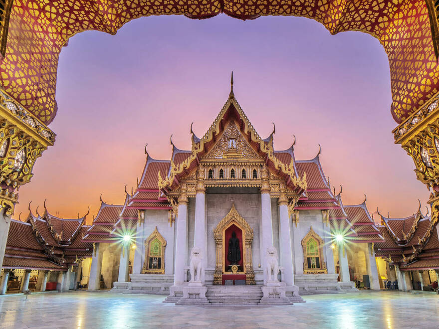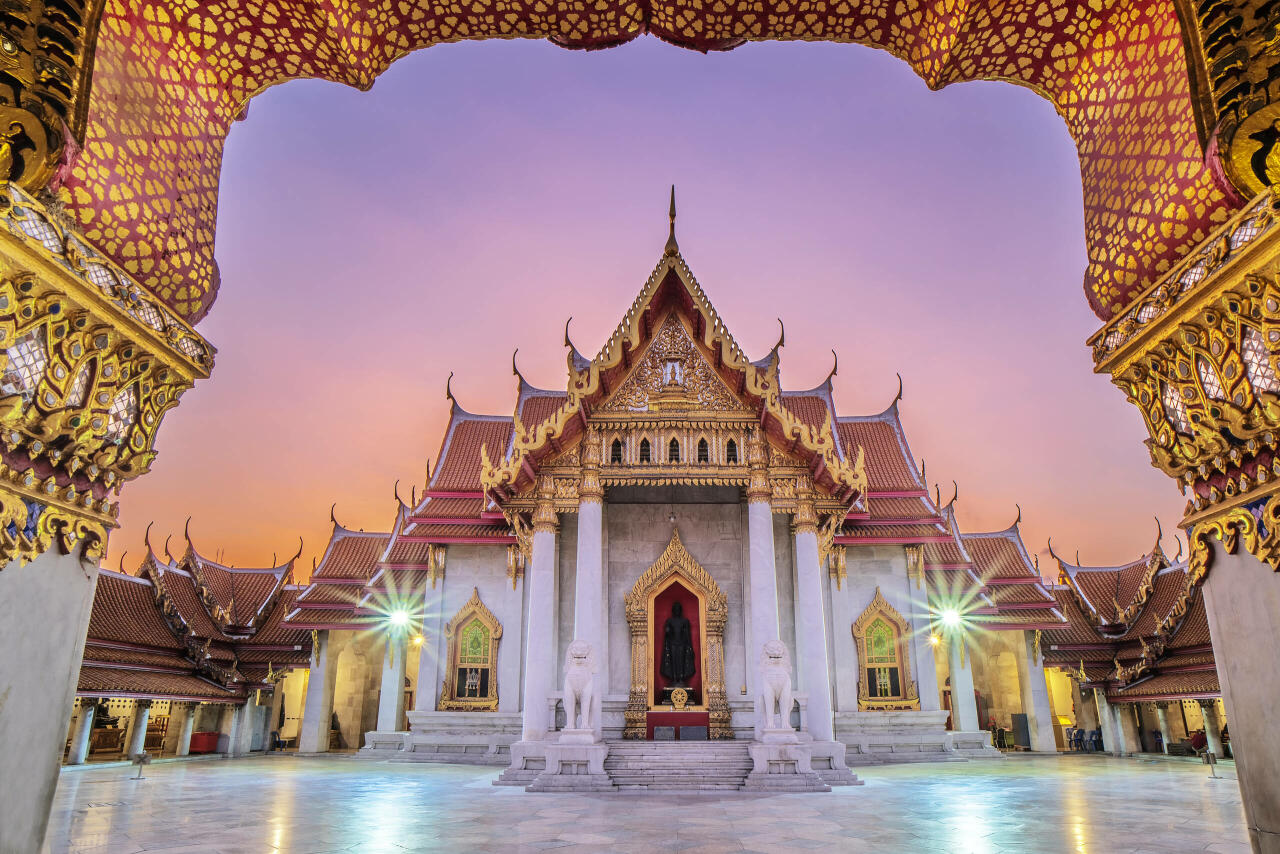 golden door marble buddhist bangkok wat benchamabophit temple morning sunrise golden sky thailand