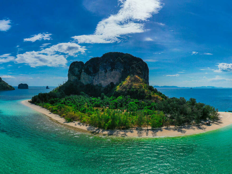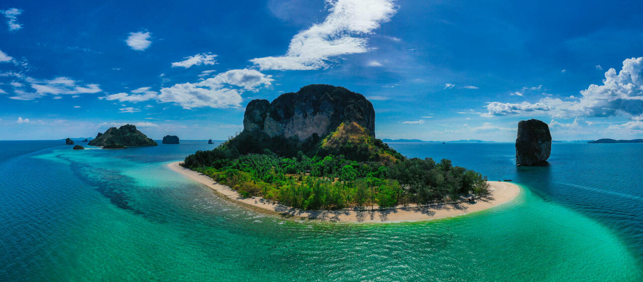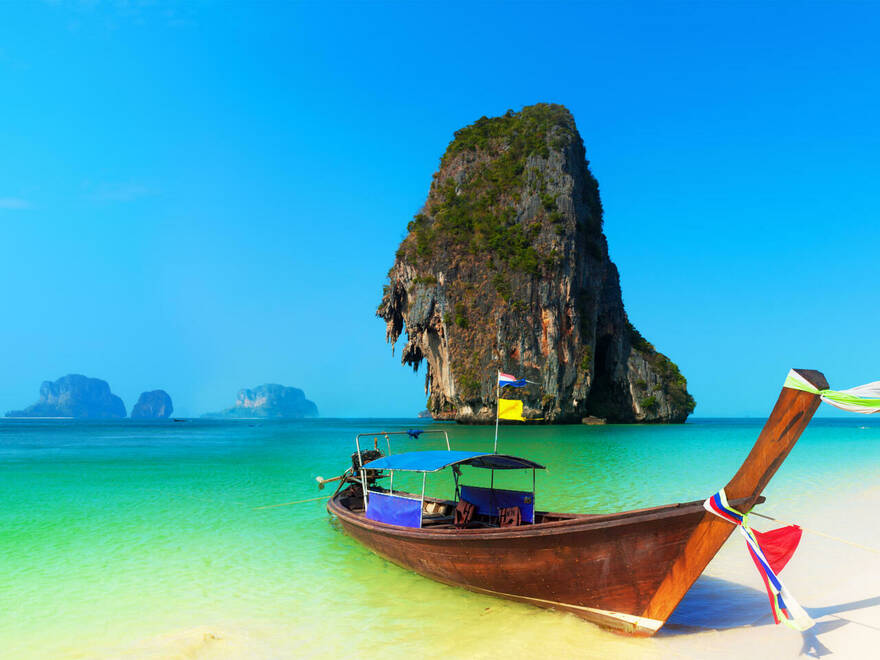 long tail boat turquoise crystal clear sea water with limestone cliff mountain phra nang beach krabi thailand