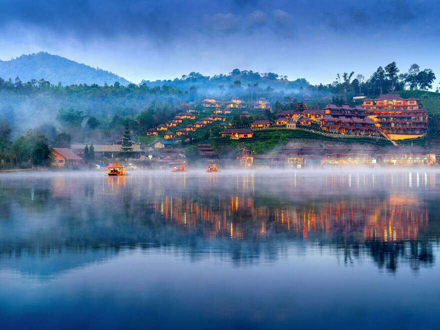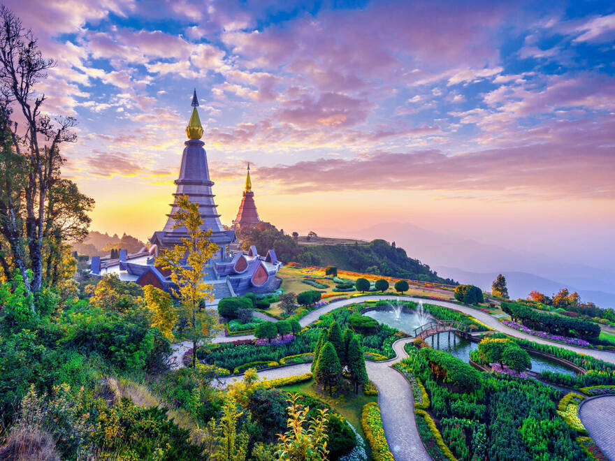 landmark pagoda doi inthanon with mist fog during sunset timeat chiang mai thailand